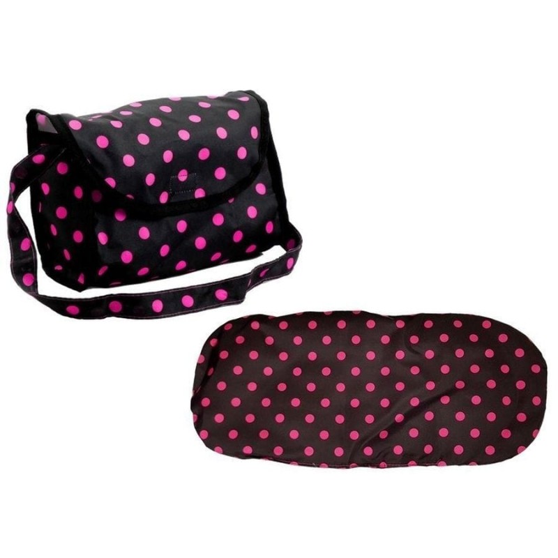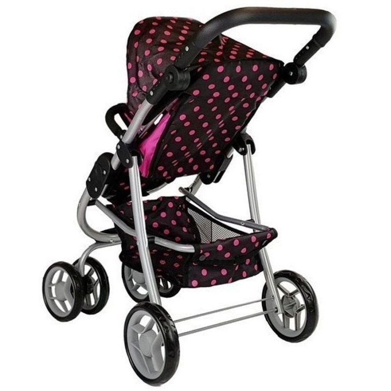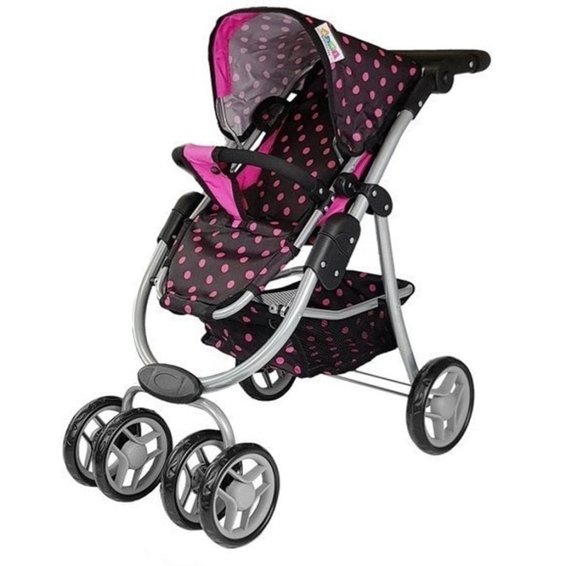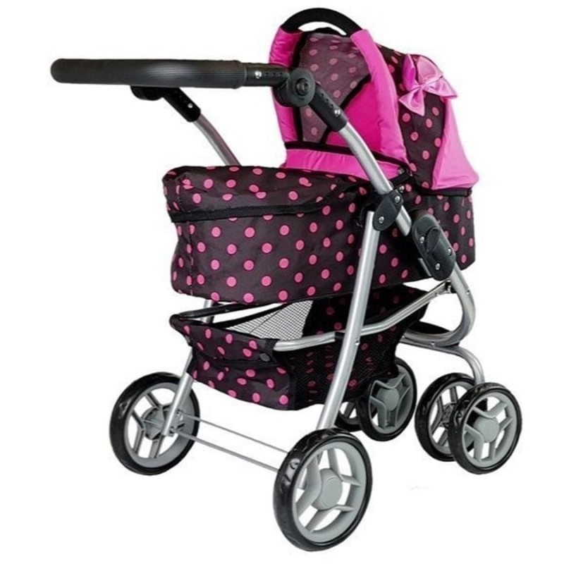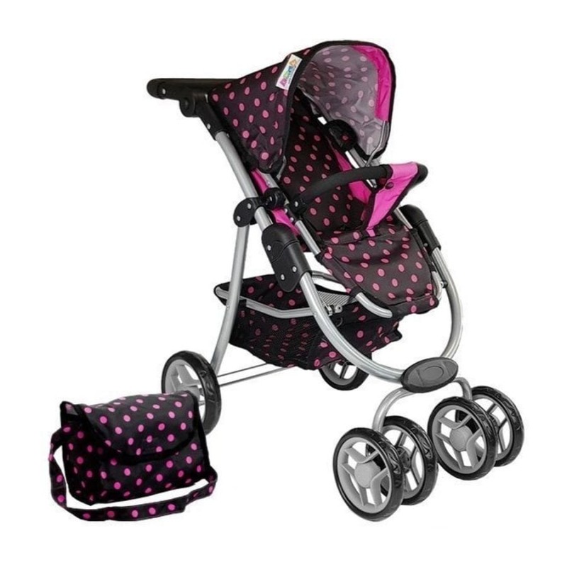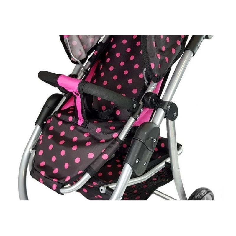 Коляска с сумкой в черный в темно-розовые точки, дает много очарования. Дизайн напоминает настоящий аналог, что добавляет реализма. Конструкция изготовлена из прочных и прочных алюминиевых трубок серебристого цвета, которые соединены черными пластиковыми фитингами. Использование для изготовления коляски высококачественного пластика отвечает за комфорт и удобство использования игрушки, что в сочетании с размещением коляски на четырех узких колесахи легкость управления тележкой и маневрирования.