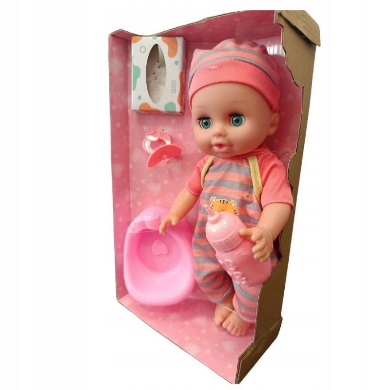 В комплект входят аксессуары: бутылка, соска, горшок, салфетки и одежда.