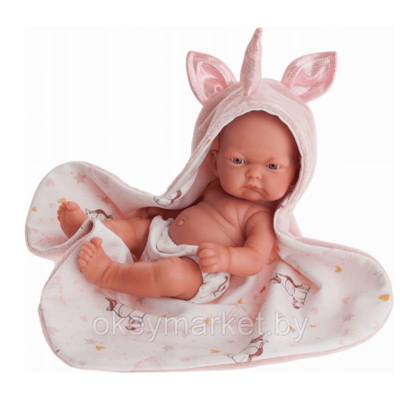 Ручки и ножки подвижные, у куклы есть гендерные признаки (девочка). Волосы тщательного прорисованы. Кукла одета в современную одежду для малышей, оригинальное одеяльце с единорогом в комплекте.