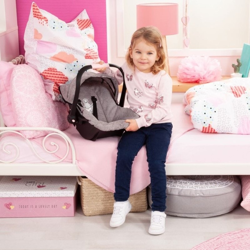 Красивое автокресло подходит для кукол до 46 см. Благодаря мягкой ткани и солнцезащитному козырьку кукла или плюшевая игрушка очень удобно сидят и защищены от солнца и ветра на лице.