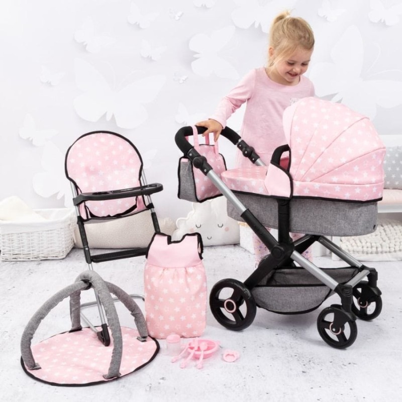 Bayer Design, Xeo Combi, глубокая тележка для кукол, набор стульчиков, коврик, сумка и аксессуары, серо-розовый