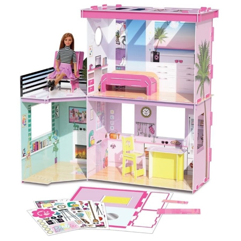 Вау! Удивительный кукольный домик Барби! Очень легко построить и собрать-его сборка занимает ок. 10 минут. Весь комплект выполнен из легких пластиковых листов. После того, как все элементы соединены, дом можно украсить наклейками в наборе! Благодаря этому мы объединяем веселье и творчество, все в уникальном стиле и цветах прямо от Барби.