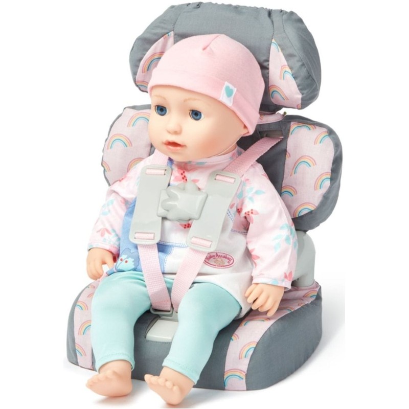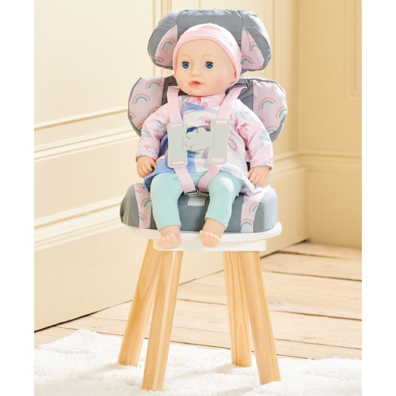 В комплекте находится очаровательный автокресло в радугу, которая пригодится во время путешествий и кормления кукол. Можно будет кормить ее, ухаживать за ней, а также брать с собой на прогулки.