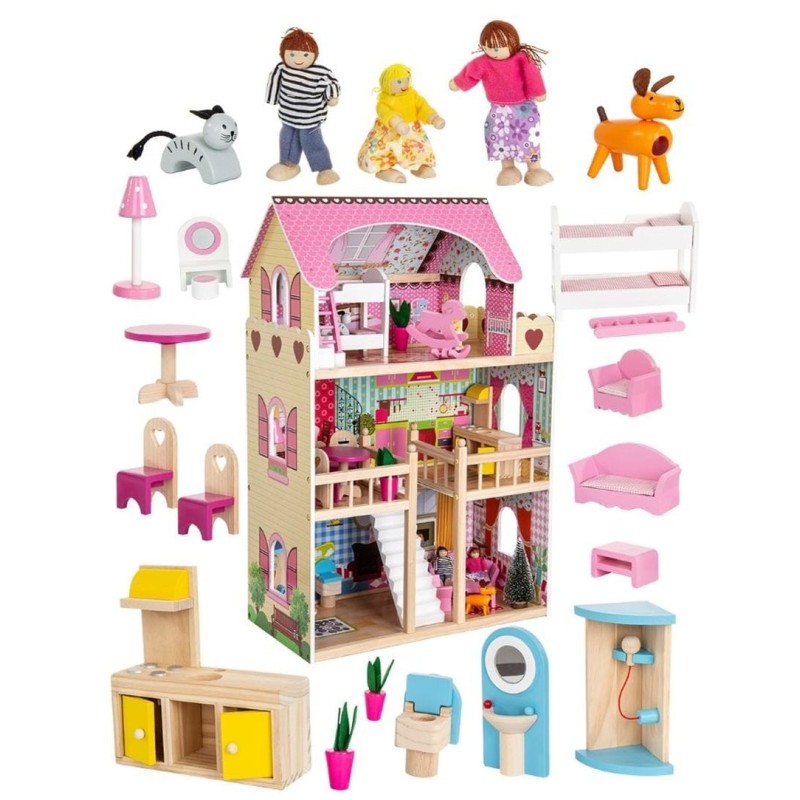 Enero Toys, деревянный кукольный домик, LED, набор с куклами и аксессуарами, XXXL