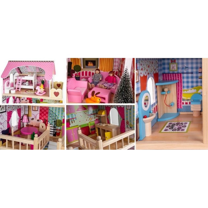 В каждой комнате этого прекрасного деревянного коттеджа есть окно, через которое проникает свет и через которое вы можете заглянуть внутрь. На цветных стенах расписаны различные предметы и элементы, дополняющие обстановку комнат, а фасад дома украшен разноцветными цветами, заборами, лампами, а на окнах нарисованы красивые ставни. Все это обязательно оправдает ожидания и мечты любого, кто мечтал о собственном кукольном домике.
