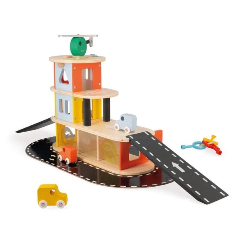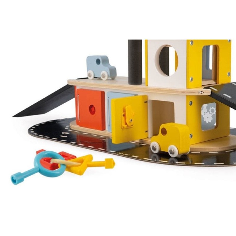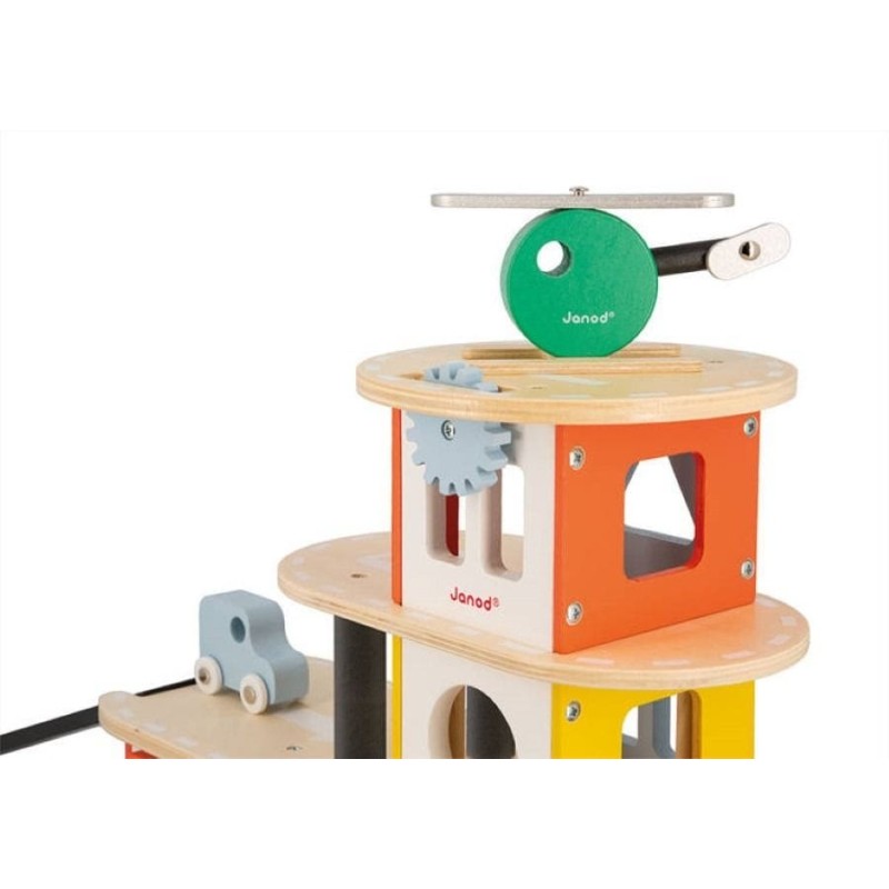 Janod, деревянный двухэтажный гараж, комплект с аксессуарами