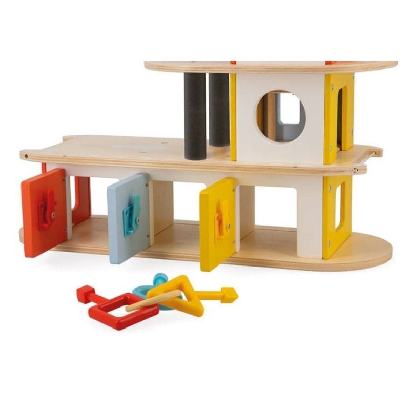 • На нижнем этаже расположены три коробки, открываемые пластиковыми ключами различной геометрической формы, входящими в комплект (функция сортировщика).