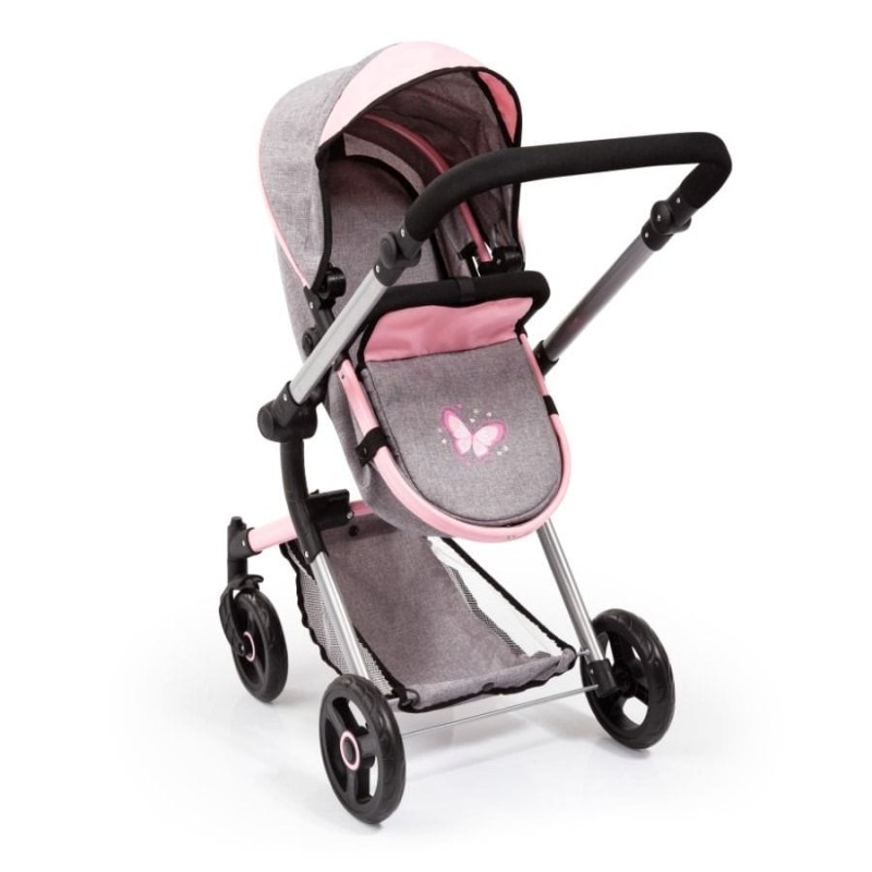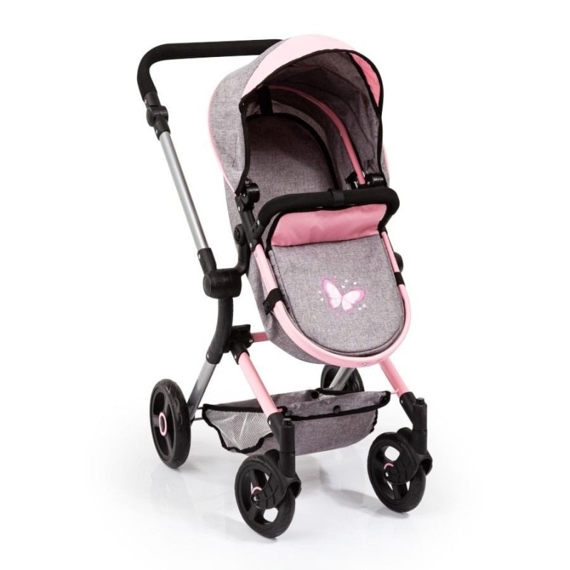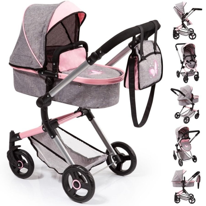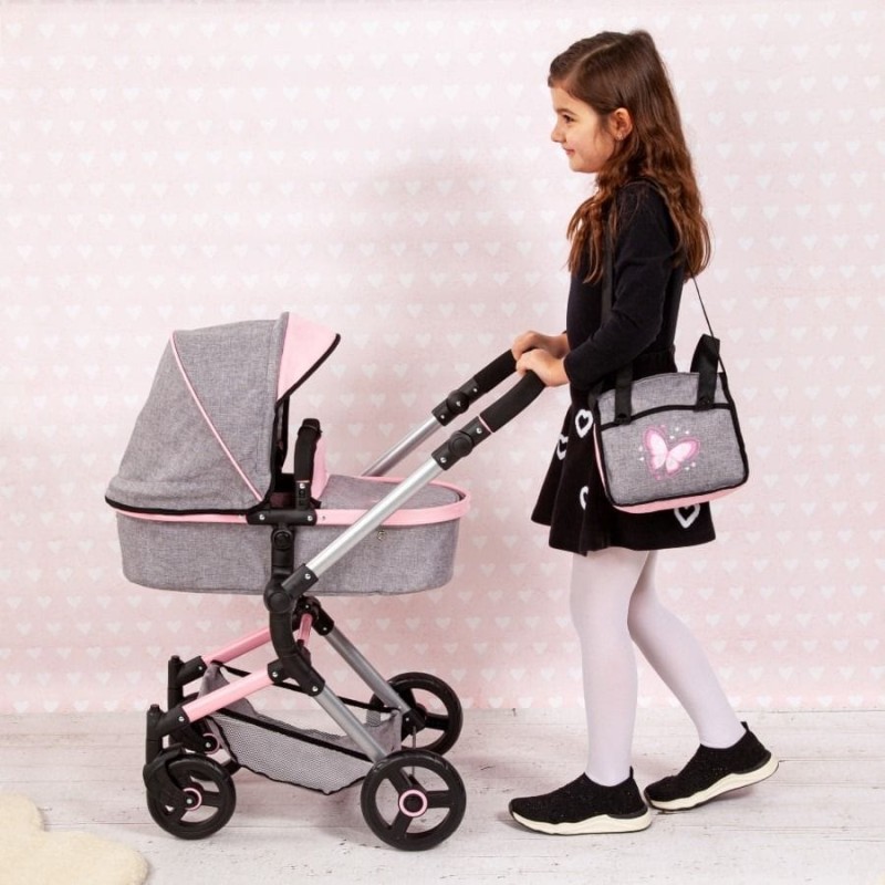 Bayer Design, Neo Vario Combi, глубокая кукольная тележка с сумкой, серо-розовая и бабочка
