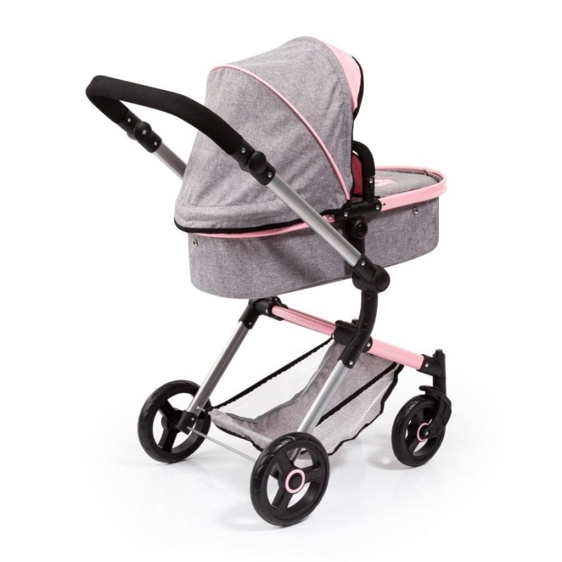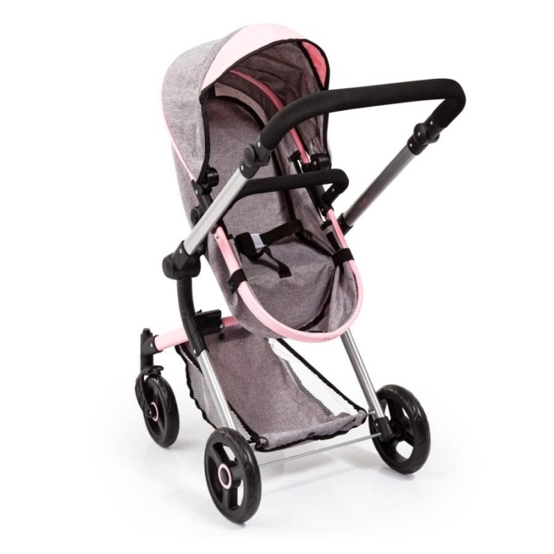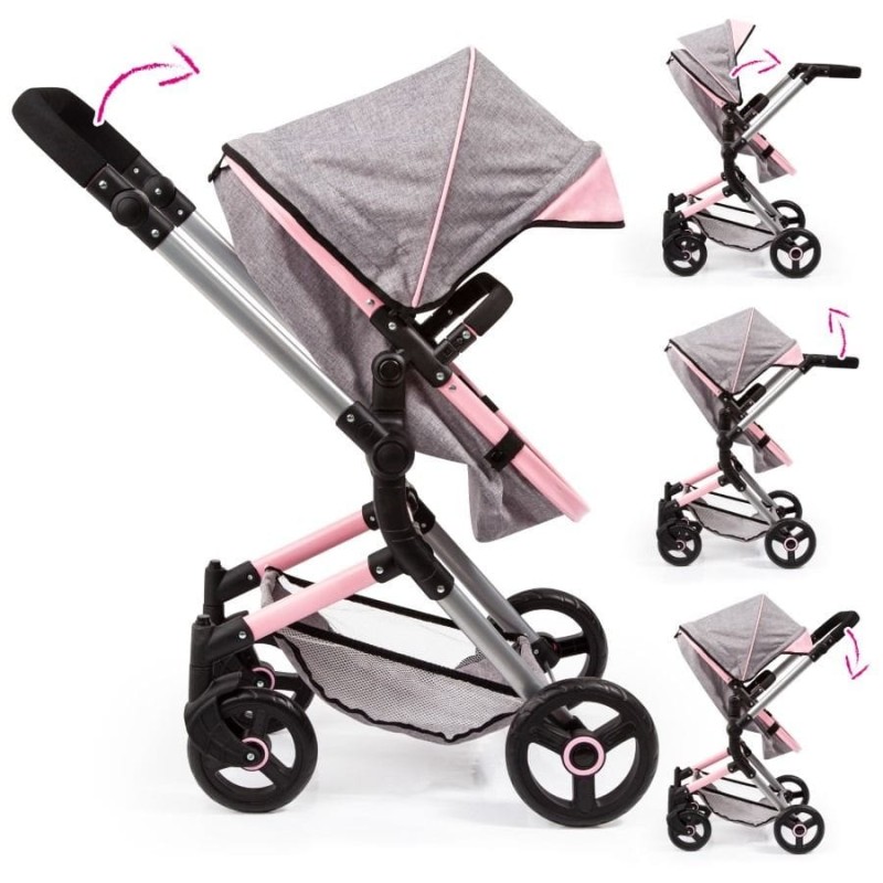 Благодаря прилагаемым защелкам и возможному изменению угла наклона переносной кроватки Кукольная коляска может быть превращена в коляску за считанные секунды. Козырек имеет двойное назначение-если кукла сидит или лежит в коляске, он защищает ее как от солнца, так и от ветра.