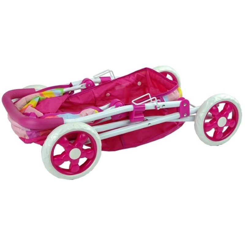 Тележка оснащена четырьмя колесами, что позволяет легко управлять ею даже по неровным поверхностям. Коляска имеет розовый цвет, что добавляет очарования. Козырек имеет цветные полосы. Все сделано из пластика.