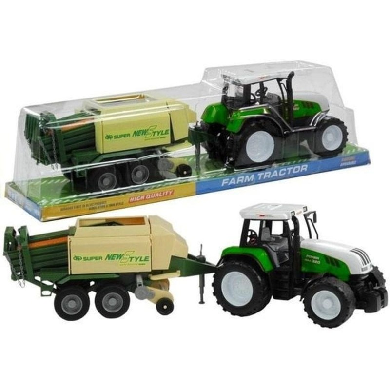 Представленный комплект изготовлен из сертифицированных материалов высочайшего качества, благодаря чему отличается не только точным воспроизведением полноразмерной машины, но и долговечностью. Игрушечный трактор-это автомобиль внушительного размера, поэтому во время игры его можно использовать маленькому фермеру для перевозки важных вещей. Соединенный с прицепом в виде соломенного пресса, он достигает в длину 65 см, что обязательно понравится малышу. Прицеп имеет подвижные элементы, такие как выдвижная опора пресса, вращающийся сачок, а также открывающиеся боковые и задние закрылки. Трактор имеет задний привод, что очень разнообразит веселье.