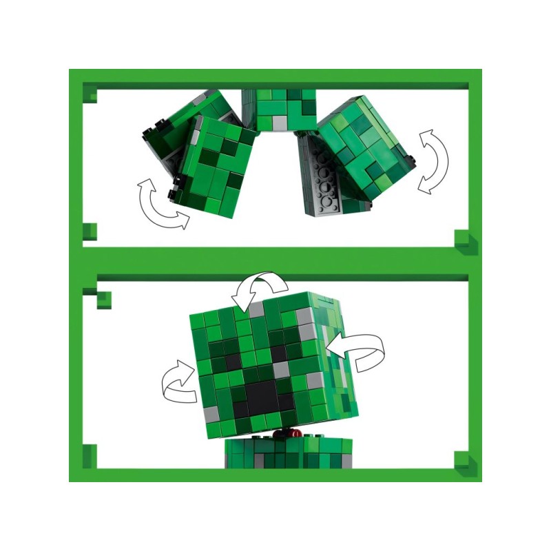 • Скрытый сюрприз — передняя часть головы фигурки LEGO Minecraft Creeper отсоединяется, открывая внутреннее пространство с первой версией минифигурки Creeper и элементом TNT.