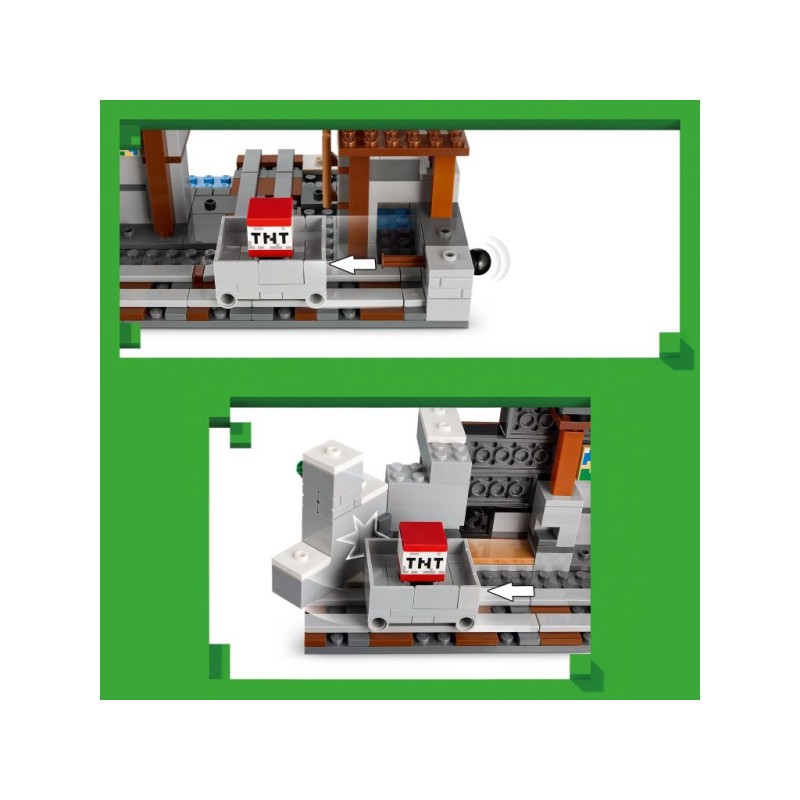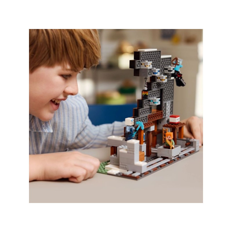 В набор входят три минифигурки: Алекс (известный по играм), шахтер и наездник на пауке. На поверхности шахты также находится фигурка маленького белого медведя. Дети добывают руду, известную из Minecraft, загружают ее в вагонетку и перевозят по рельсам, чтобы поместить в сундук. Тележку также можно наполнить тротилом и выстрелить в скалу, прорвавшись на другую сторону. А когда день шахтерских приключений подойдет к концу, игрушечная кирка LEGO Minecraft может послужить ярким украшением. Для дополнительного цифрового развлечения используйте приложение LEGO Builder, чтобы масштабировать, вращать и отслеживать свой прогресс в 3D. В наборе 530 деталей.