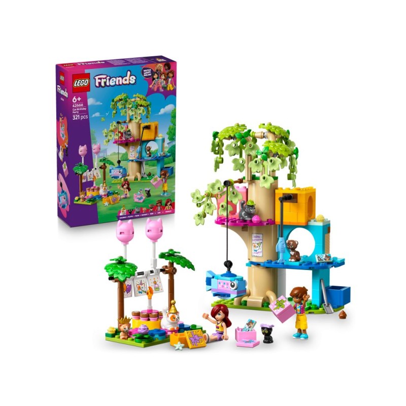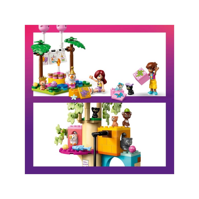 • Творческие истории с персонажами LEGO Friends — в этот набор входят мини-фигурки Лео и Пейсли, 5 фигурок кошек, домик для кошек на дереве и сборная сцена праздничного торта.