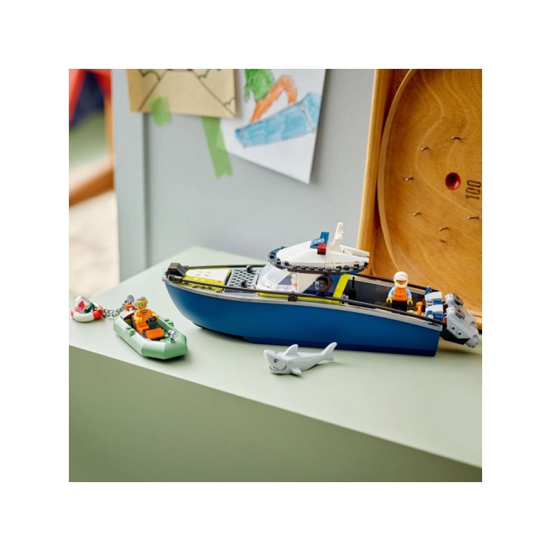 • Особенности и функции - Дети могут поместить две минифигурки полицейских в кабину полицейского катера, запереть преступника в камере и поместить надувную лодку и полицейский катер в воду, чтобы создать реалистичные ролевые сцены.