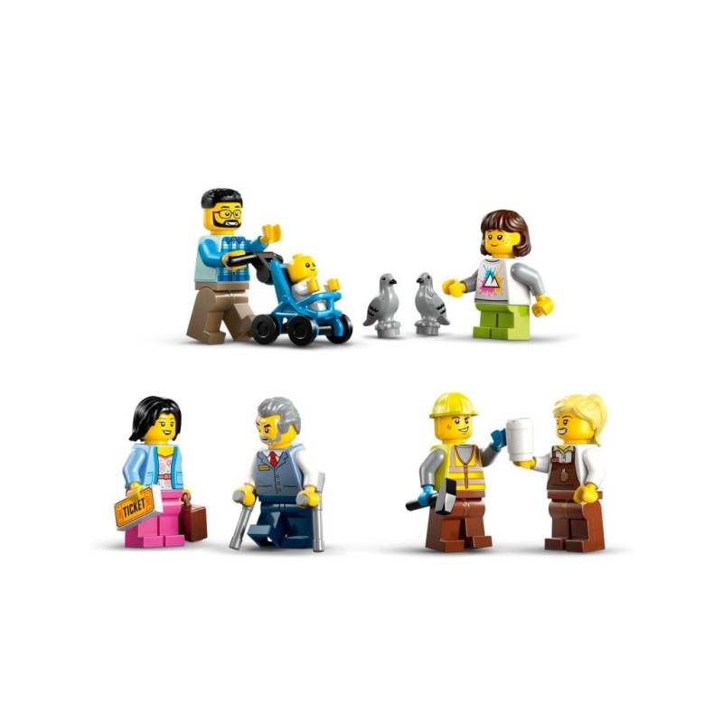 • В набор входит все необходимое детям для строительства железнодорожной станции, служебный вагон с лифтом, а также 6 минифигурок, фигурка ребенка и 2 фигурки голубей для ролевой игры.