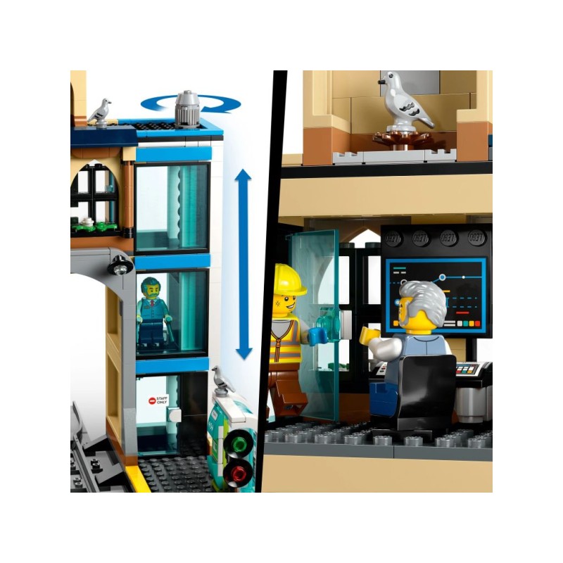 Для детей в возрасте от семи лет и старше этот игровой набор «Центральный железнодорожный вокзал» LEGO City (60469) полон интересных функций на трех уровнях. На станции, увенчанной классической часовой башней, есть уютное кафе, работающий лифт, диспетчерская, автобусная остановка, две платформы, табло с расписанием движения и билетный автомат. В набор также входит служебный фургон с подъемником для корзин, а также шесть минифигурок, фигурка ребенка и две фигурки голубей для ролевых игр и повествования.
