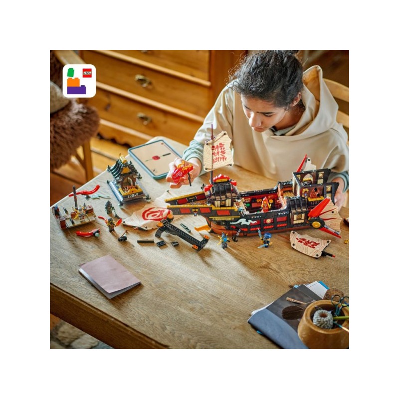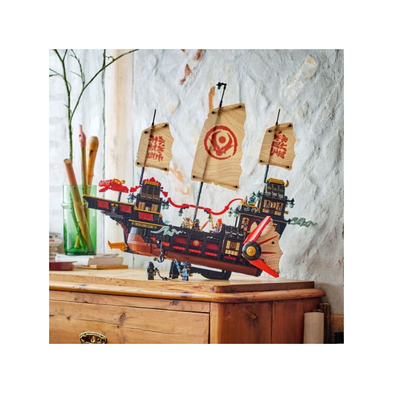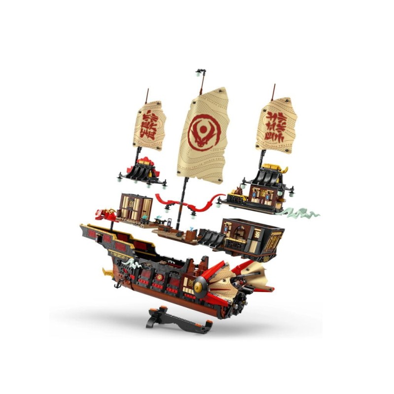 В этом интерактивном наборе есть все, что нужно поклонникам ниндзя для воссоздания историй из третьего сезона сериала «NINJAGO: Восстание драконов», включая механизм для перемещения парусов, а также съемные крыши и полы для доступа внутрь корабля. В главной каюте есть суши-бар и стол, который складывается, открывая доступ к секретному компьютеру.
