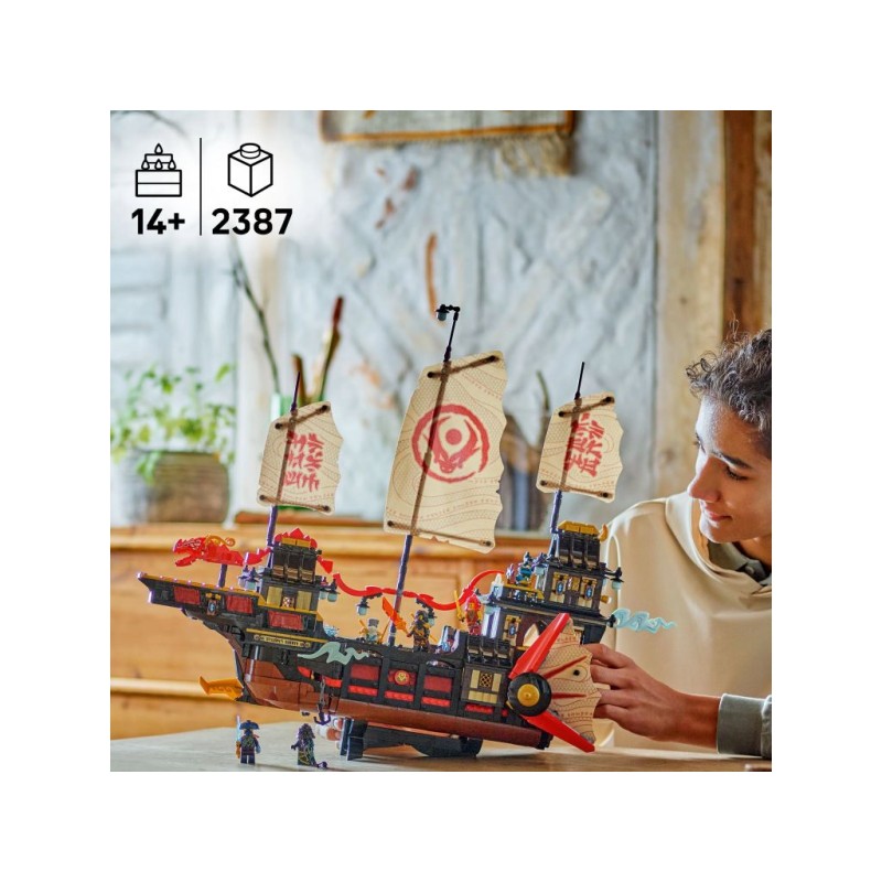 • Интерактивный набор корабля — поклонники NINJAGO могут поворачивать шестерни, чтобы двигать паруса, снимать крыши и полы, чтобы получить доступ к интерьеру и суши-бару, а также складывать стол в главной каюте, чтобы раскрыть секрет.