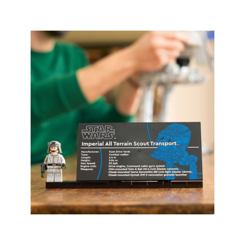 • Соберите и украсьте свое творение – покажите его вместе с табличкой и эксклюзивной минифигуркой водителя шагохода AT-ST LEGO Star Wars с имперским гербом на плечах и бластерным пистолетом.