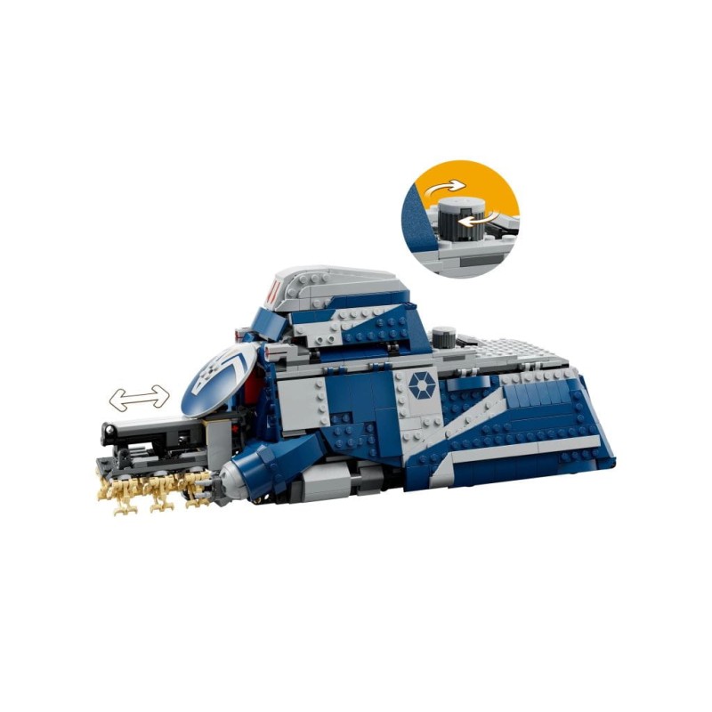• Реалистичные детали — поверните ручку на верхней части МТТ, чтобы активировать станции дроидов, выдвинув их из переднего люка, а затем отсоедините боевых дроидов.