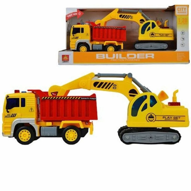 • В комплекте мы находим желтый экскаватор с подвижным ковшом, а также самосвал с механическим приводом и открывающимся клапаном