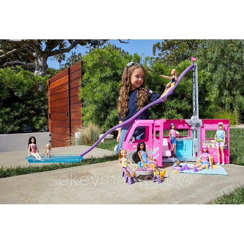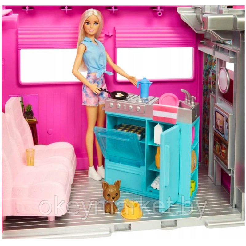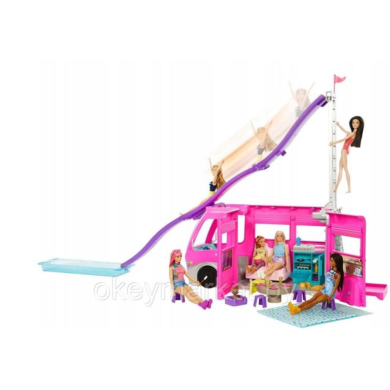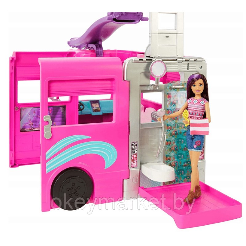 Отправляйтесь в поход с кемпером мечты Барби DreamCamper! Этот автомобиль Барби вдохновляет на бесконечные приключения на свежем воздухе. С вращающимися колесами и кабиной на двоих вы можете добраться до любого места своей мечты. Когда вы доберетесь до места назначения, припаркуйте дом на колесах и разложите его, открыв кухню, ванную комнату, бассейн, горку и зону отдыха с телевизором и создав обеденную зону и спальню на открытом воздухе.