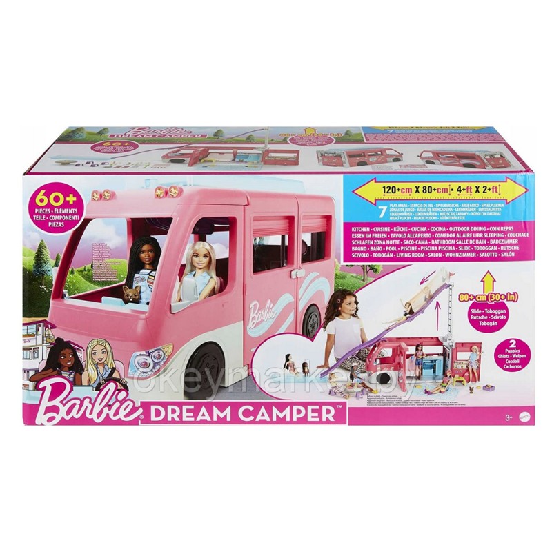 Помогите кукле Барби и ее друзьям (куклы не входят в комплект) подняться по лестнице, а затем спуститься по горке в бассейн с большим всплеском! Персонализируйте автомобиль Барби с помощью листа наклеек на бампер с тематикой кемпинга и откройте для себя безграничные возможности для веселья с более чем 60 предметами, включая две фигурки щенков! Когда куклы будут готовы к следующему приключению, упакуйте все в дом на колесах и закройте его, чтобы отправиться в путь.