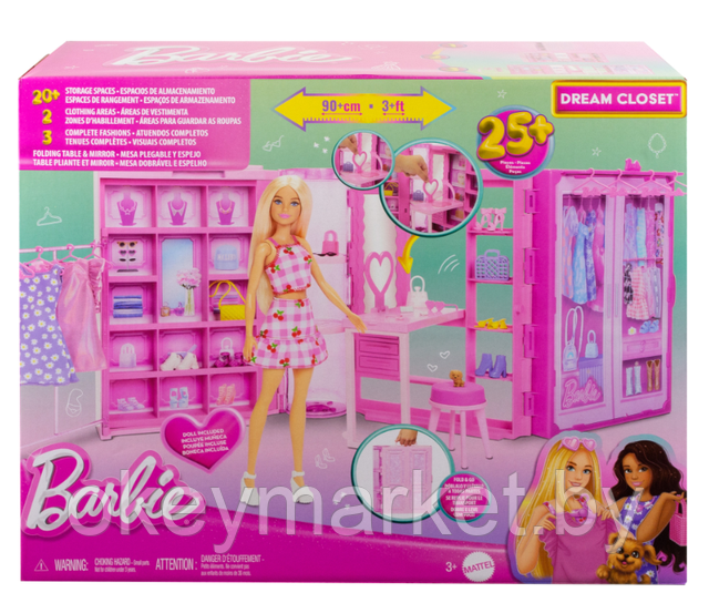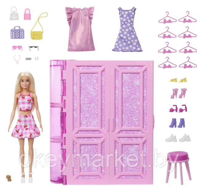 Содержание: 1 шкаф, 1 кукла, 3 полных наряда (одежда Барби), 8 вешалок, 9 аксессуаров, 5 пар туфель, 1 фигурка собачки и 1 табурет.