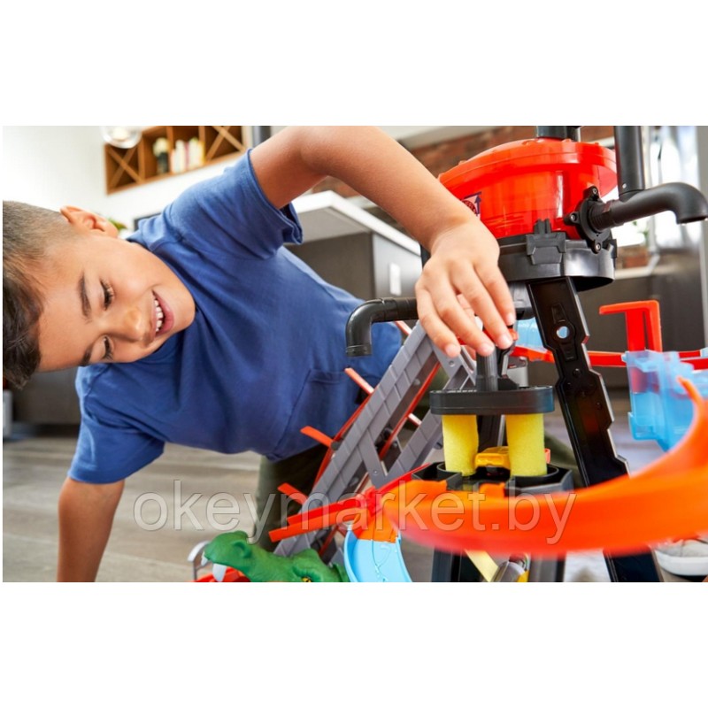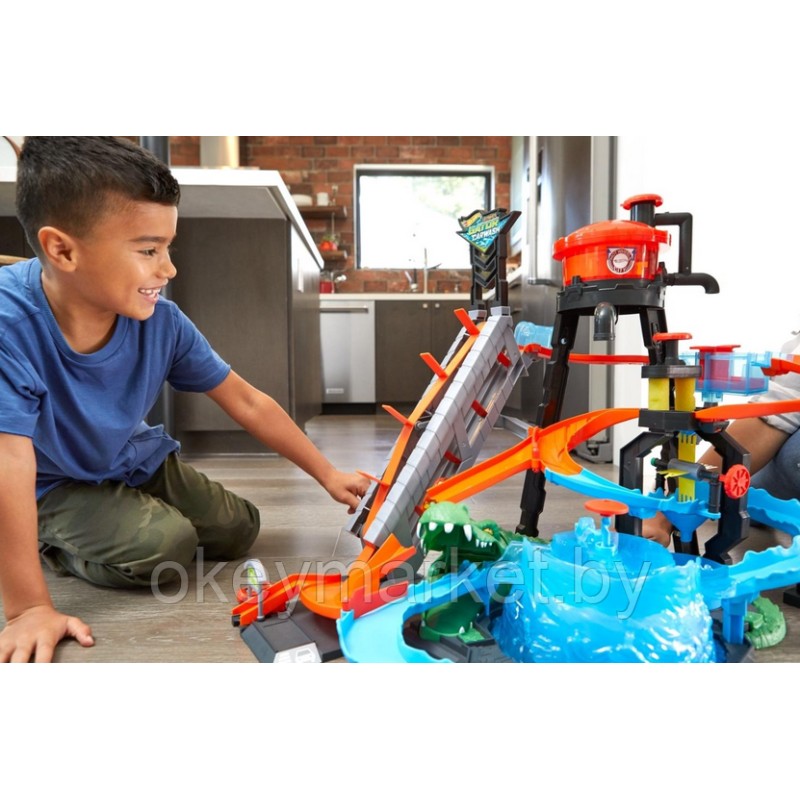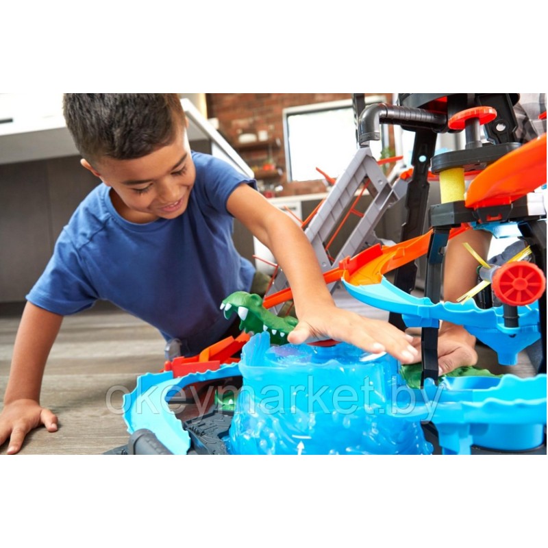 Крокодилья автомойка от Hot Wheels "Ultimate Gator Car Wash" подарит вам долгие часы увлекательной игры с водой и разноцветными превращениями! Попробуйте спастись из стремительного водоворота, избегая челюстей гигантского крокодила! Путешествие машинок начинается с громадного подъемника, который доставит их наверх. Поверните кран на водонапорной башне, чтобы помыть машинку и волшебным образом поменять ее цвет! Пора отправляться дальше вниз по безумной трассе сквозь подвижные щетки и валики автомойки - прямиком в бурлящий водоворот, где чудо-машинка вновь сменит свой цвет! Детям придется применить всю свою фантазию, чтобы выбраться из водоворота, проскочить мимо страшных зубов крокодила и устремиться дальше, к новым удивительным приключениям.