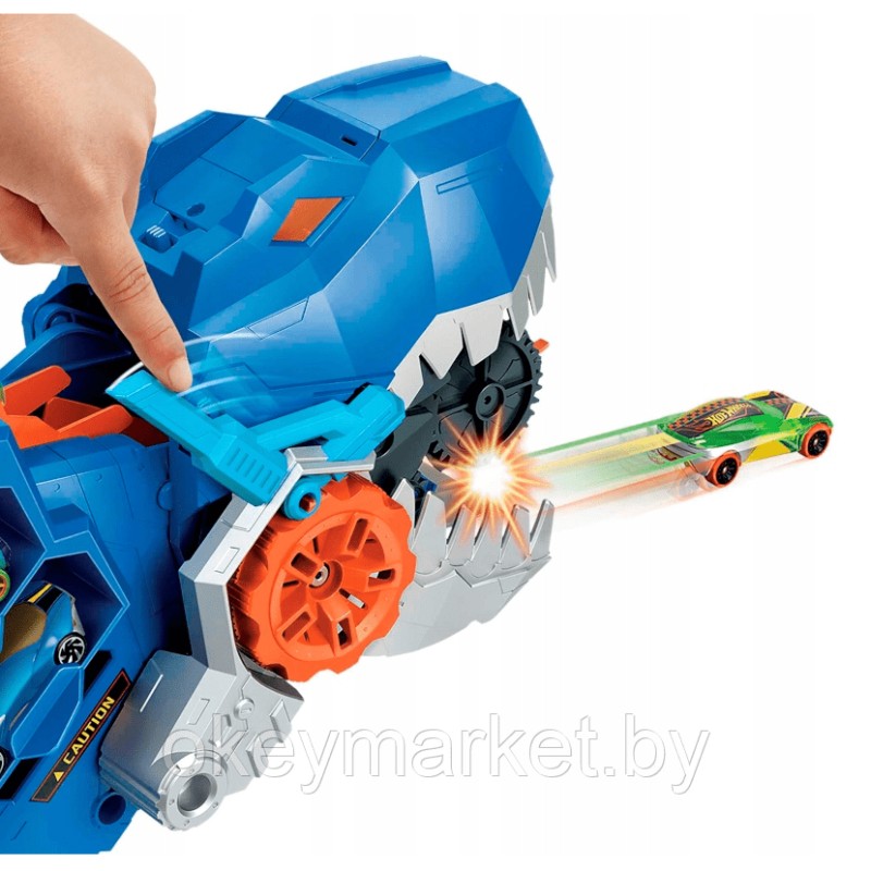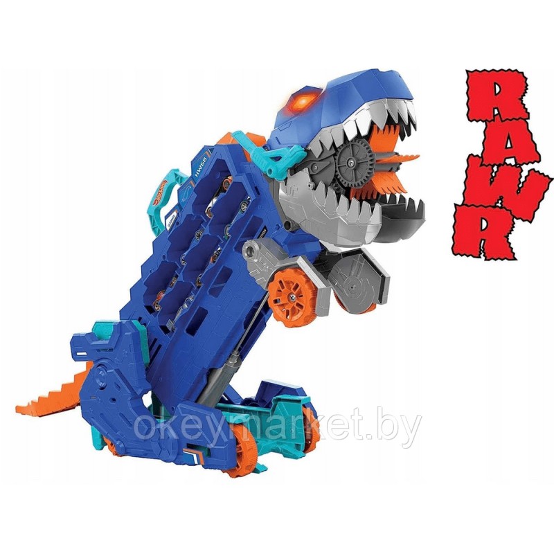 Трек Хот Вилс оснащен световыми (светятся глаза) и звуковыми (рычит) эффектами. Данный набор является треком 2 в 1: автовоз и трасса с пусковым механизмом. Колеса подвижные, грузовик вмещает в себя более 20 машинок одновременно и выполнен в виде тираннозавра, который может "поедать" машинки (в комплект входит 1 машинка). Во рту у него имеется язычок-мельница, который подхватывает машинки во время движения автовоза, так же он издает звуки и у него светятся глаза. Чтобы сделать трассу, потяните оранжевый хвост на себя до упора. Автовоз превратится в тираннозавра, который начнет рычать и "станет" на задние лапы. На спине у него расположена гоночная трасса с 2 полосами для движения, к концу хвоста можно прикрепить дополнительно трассу (приобретается отдельно). Так же можно запускать машинки из пасти тираннозавра. Для этого установите машинку за голову и нажмите сбоку на голубой рычаг. При нажатии на него тираннозавр издает рык и у него светятся глаза.