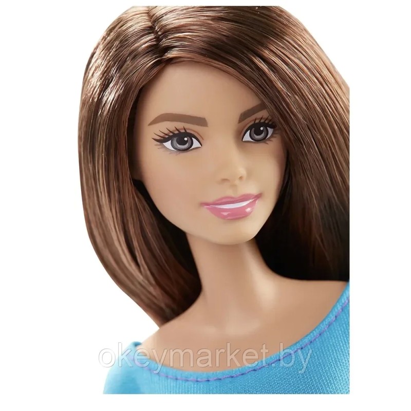 У данной модели куклы минимальный макияж, накрашены легко ресницы, есть подводка. губки слегка накрашены розовым блеском. У нее широкие густые брови - современная модная тенденция. Волосы длинные каштановые. Одета Барби в голубой короткий топ с окантовкой внизу и облегающие черные бриджи.