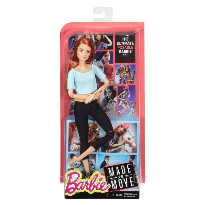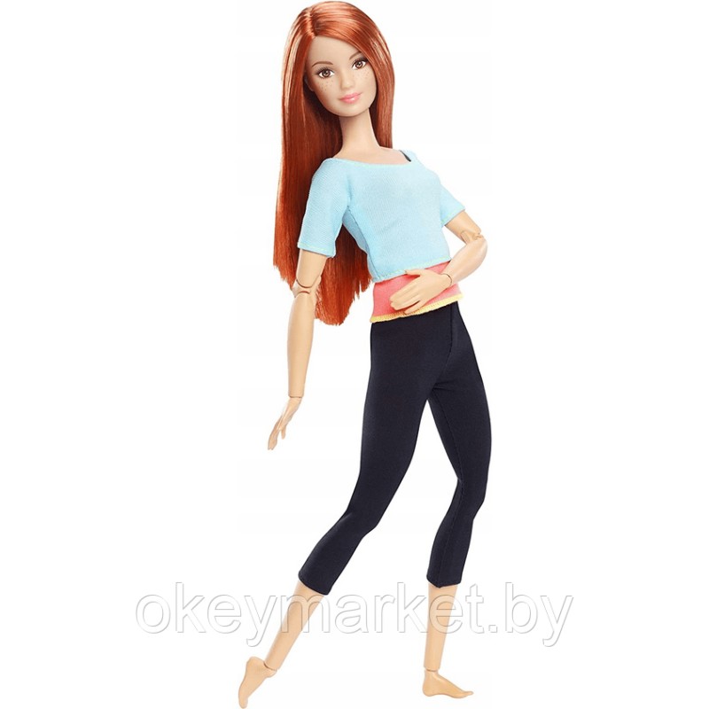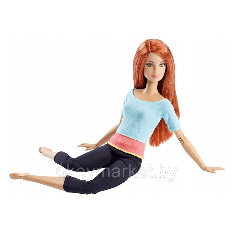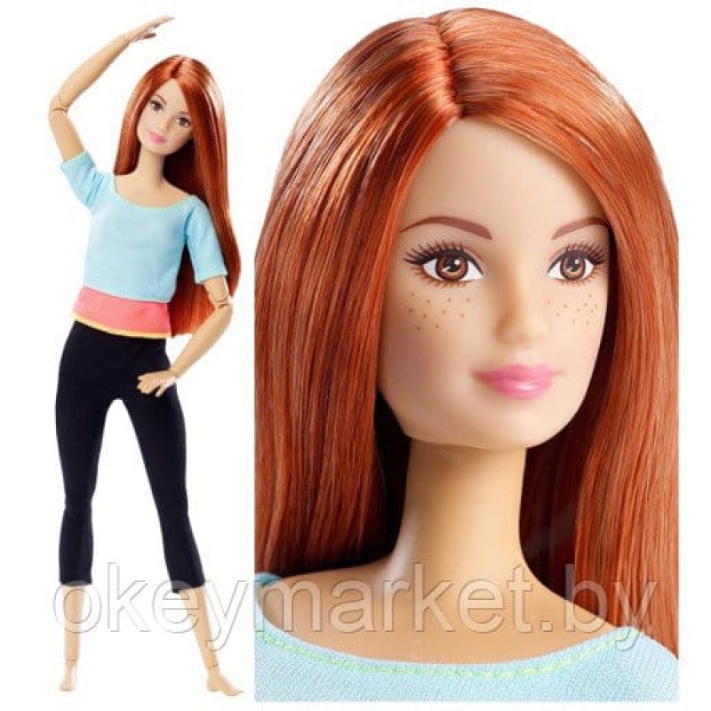 Кукла Барби безграничные движения с веснушками, рыжие волосы, в голубом топе. Кукла полностью подвижна и может принимать любые положения. Можно сказать, что это Барби для йоги и спорта.