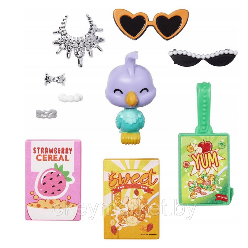 В комплекте : 1 кукла в наряде и обуви, 1 боа, 1 фигурка питомца, 11 аксессуаров