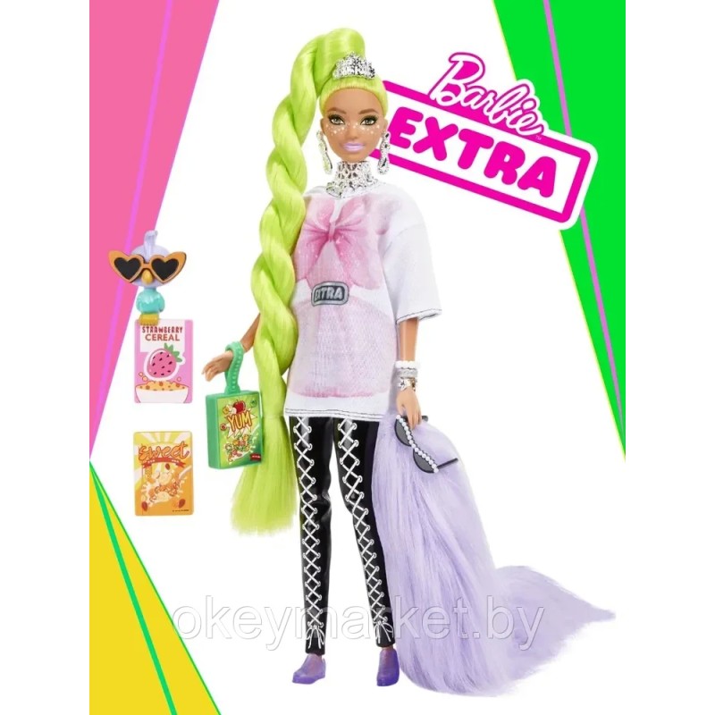 Куклы Barbie “Экстра” – воплощение смелых образов в сочетании с яркими цветами! Эта кукла с зелеными неоновыми волосами отличается уникальным стилем, который позволяет ей всегда быть на высоте. Одежда и макияж в стиле рок-звезды, длинная закрученная коса, и попугайчик, полный обаяния и харизмы, сделают Барби звездой любой вечеринки. Блестки, море аксессуаров и необычные волосы – каждая деталь создает особую атмосферу везде, где бы вы ни оказались вместе с любимой куклой!