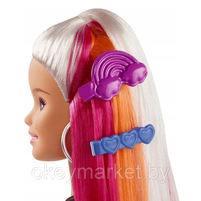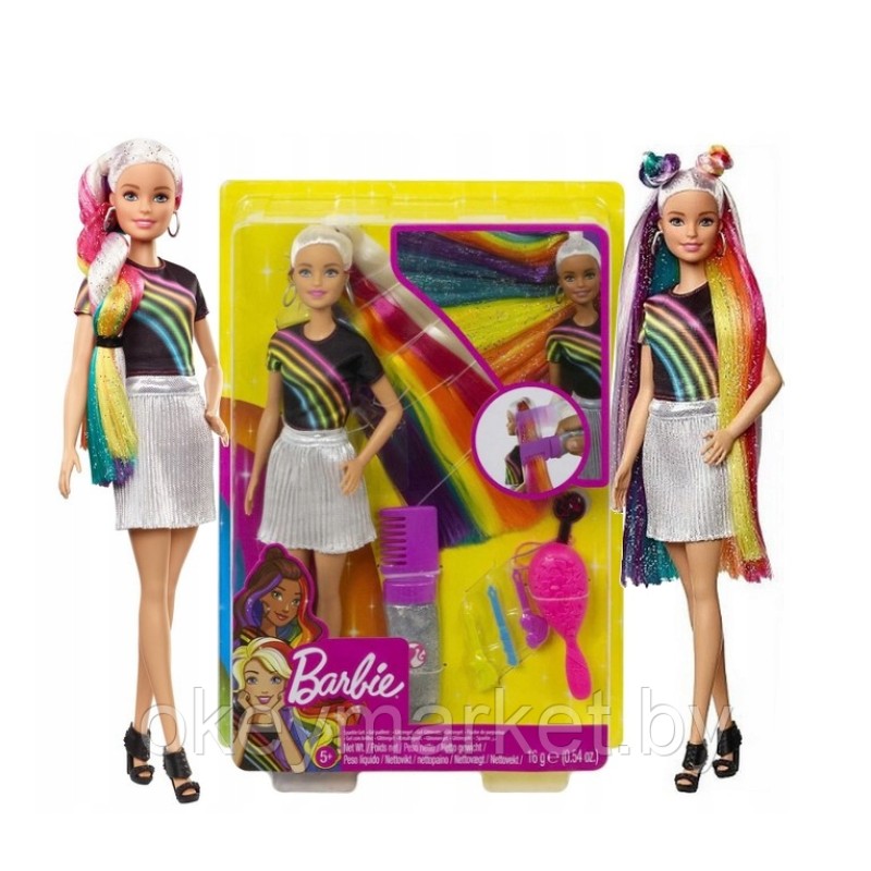 Прекрасная Барби с роскошными радужными волосами приведет в восторг любую девочку и станет отличным подарком маленькой принцессы! Кукла просто очаровательна: ослепительная улыбка, выразительные глаза и необычные локоны не оставят равнодушной вашу малышку. Великолепные волосы Барби можно расчесывать и укладывать в яркие сверкающие прически с помощью специальных аксессуаров. Например, щетка, маленькие резинки и милые разноцветные заколочки позволят создать сложную укладку, а при помощи тюбика с блестками волосам куклы можно добавить мерцающего сияния. Барби одета в модный черный топ с радужными полосками, серебристую переливающуюся юбку. Стильный образ куклы дополняют круглые серьги и черные босоножки на высоких каблуках. Barbie и связанные с ним товарные знаки, и фирменный стиль принадлежат Mattel.