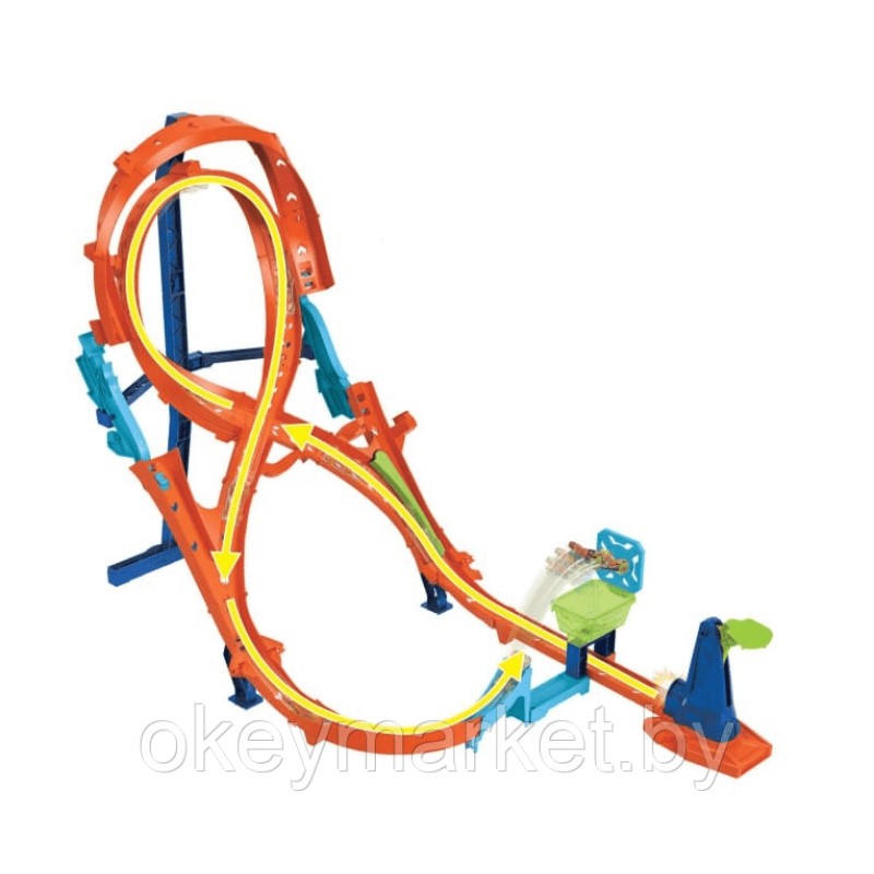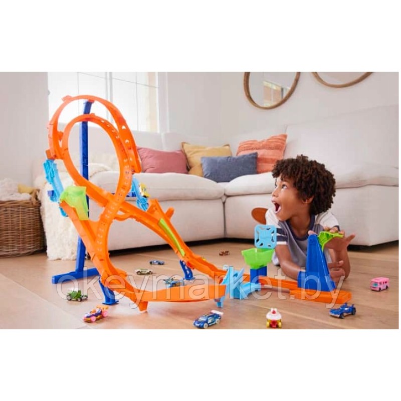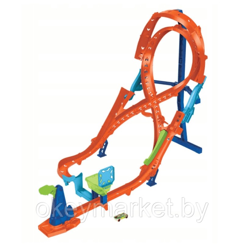 Один маршрут проходит через извилистую трассу в форме восьмерки, а другой - через вертикальный поворот на внешней трассе с двумя каскадерскими прыжками посередине. Прежде чем загрузить пусковую установку и отправить входящий в комплект автомобиль Hot Wheels по гусенице высотой 60 см, обязательно переведите переключатель.