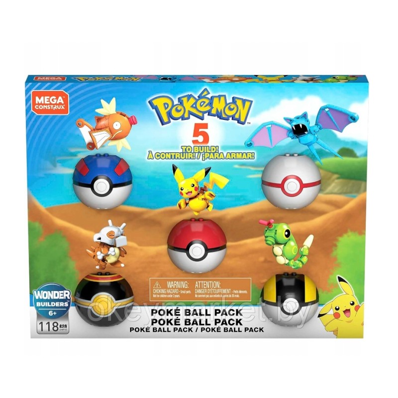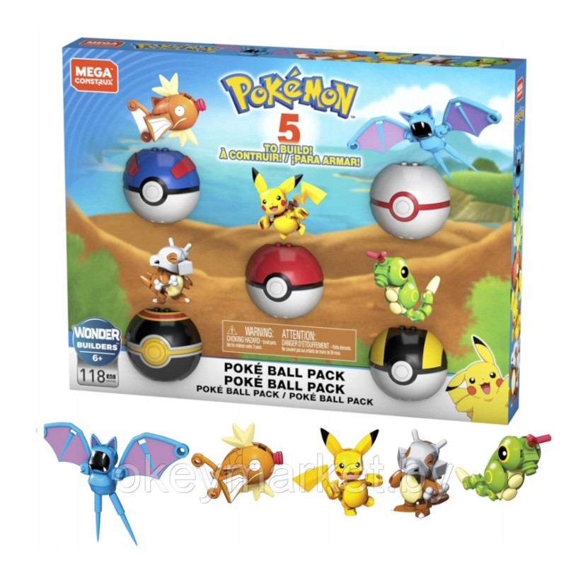 В набор входит 118 строительных элементов, из которых можно собрать до 5 фигурок покемонов и 5 покеболов.