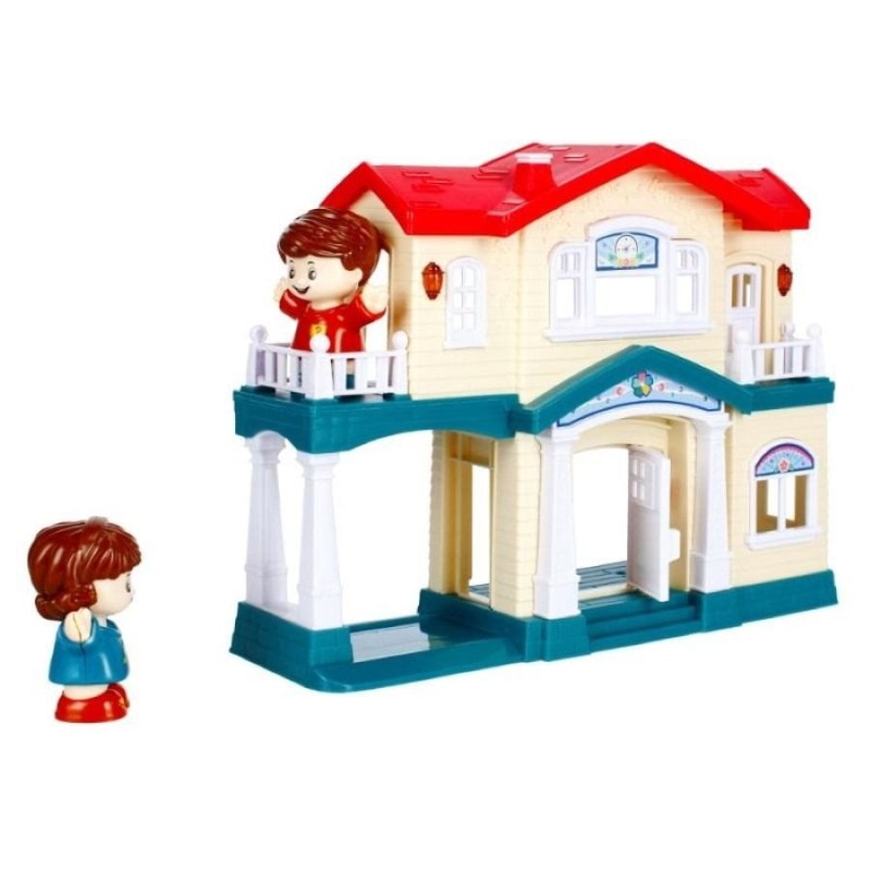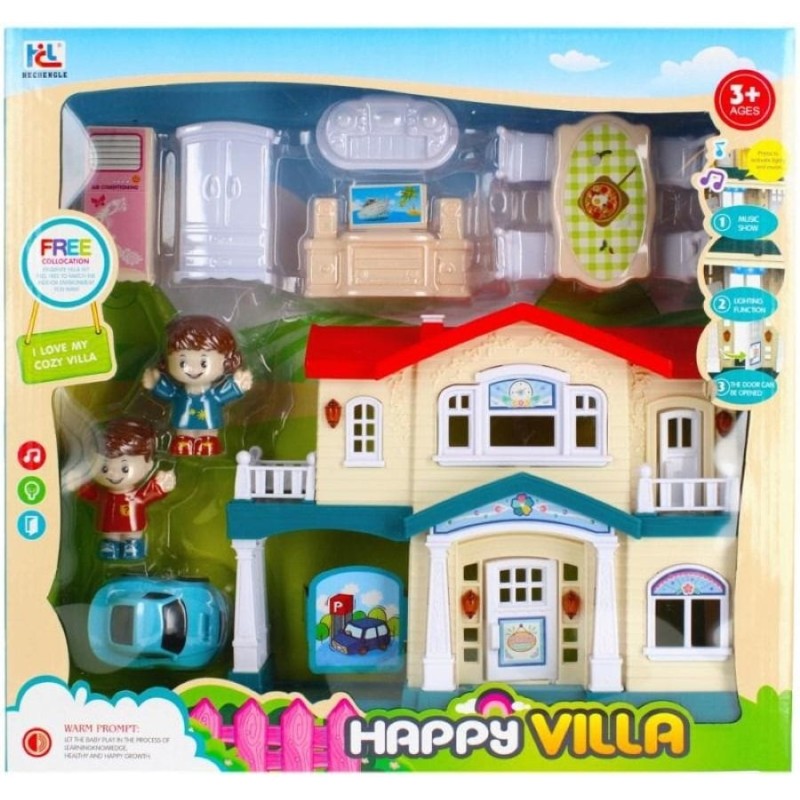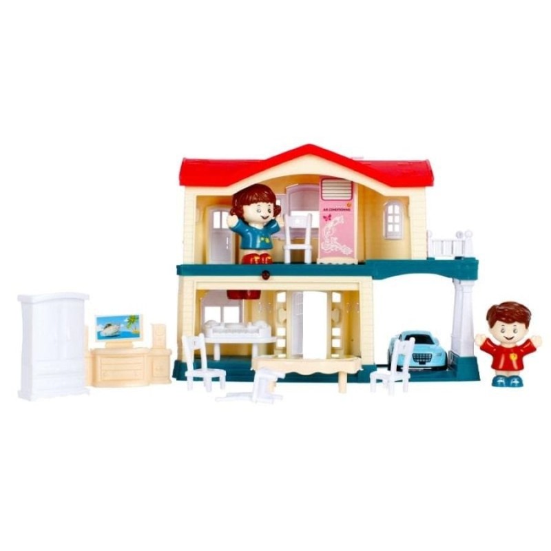 Комплектация: домик, 2х маленькая кукла, мебель для гостиной и столовой, игрушечный автомобиль.