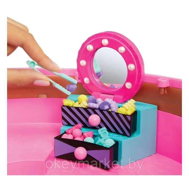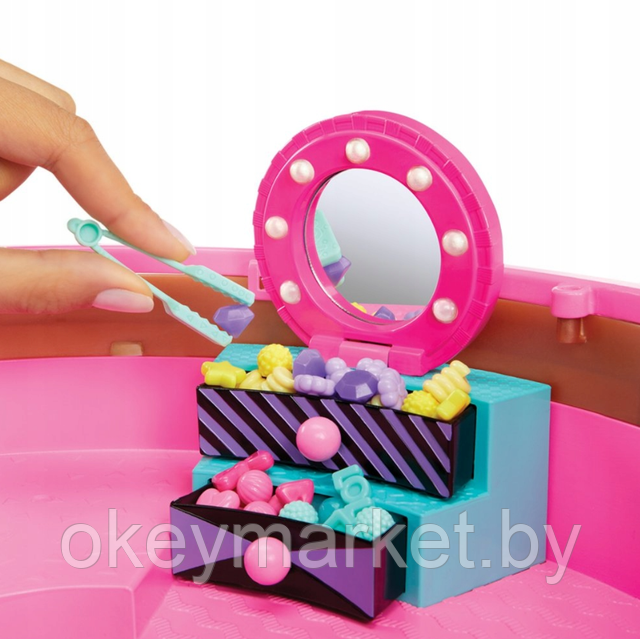 Это целый салон красоты с туалетным столиком, зеркалом, креслом и множеством отсеков для хранения аксессуаров! В наборе большое количество разнообразных бусин и 3 набора прядей, резиночки и манекены – все, что необходимо для создания ярких и креативных причесок! Набор складывается, как чемоданчик – удобно хранить аксессуары и брать с собой!