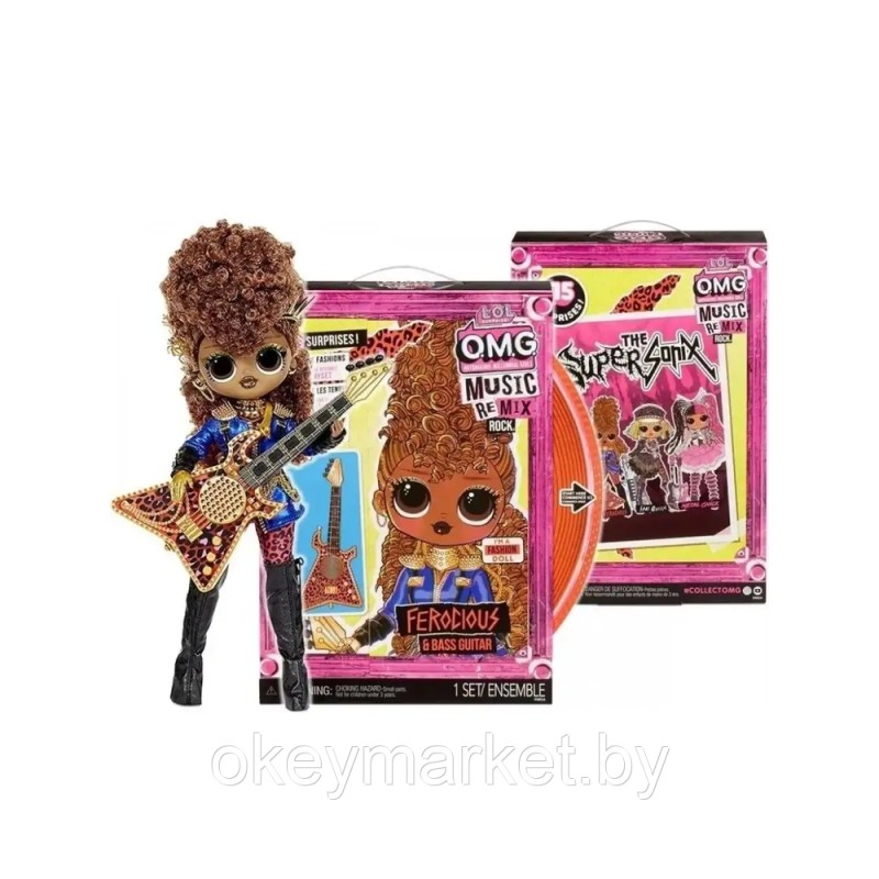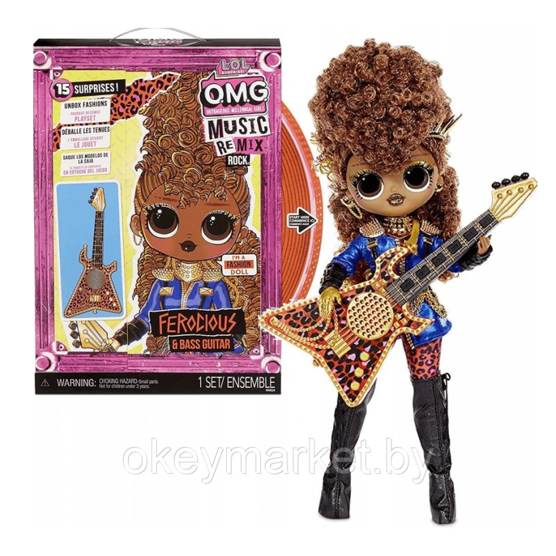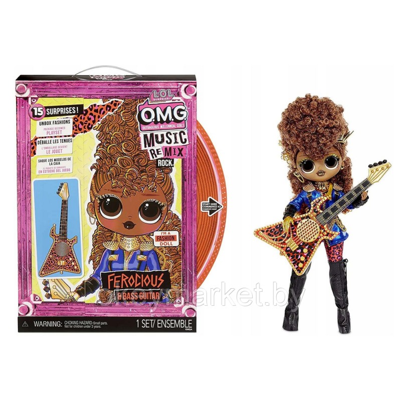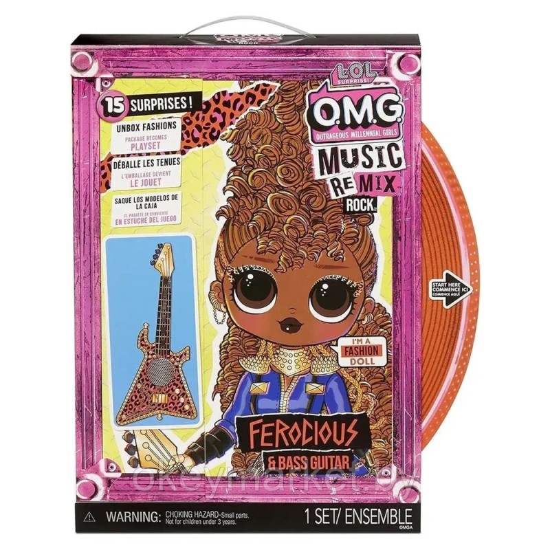 Музыкальная фэшн дива LOL OMG Remix в стиле рок по имени Ferocious. Кукла высотой 25 см прячется в необычной упаковке – музыкальном боксе, который воспроизводит музыку, а также является головоломкой – нужно будет собрать куплеты песни. Ferocious с прической из кудрявых рыжих волос и карими глазами одета в синий пиджак с золотыми цепями, красные легинсы с леопардовым принтом, на ногах высокие ботфорты на синей подошве с леопардовым принтом. Музыкальный инструмент – басс-гитара.
