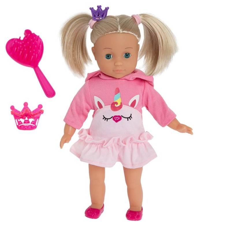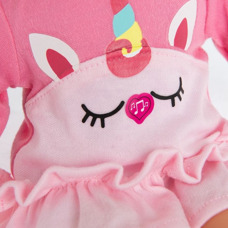 • Кукла одета в симпатичную розовую одежду с единорогом.