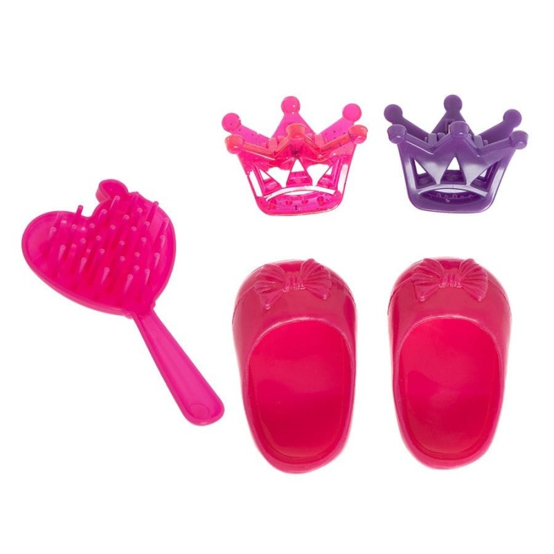 • К кукле прилагаются аксессуары: заколки, щетка и туфли.