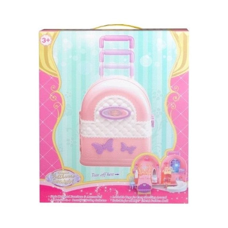 Мебель для кукол, помещенная в удобный чемодан, позволит девочкам брать игрушку куда угодно.