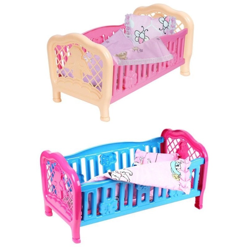 Раскладная кукольная кроватка с одеялом и подушкой. Детская кроватка имеет интересные украшения (бантики, ангелы на облаке). Легко складывается. В упаковке мы также находим комплект постельного белья из настоящего материала. Постельное белье имеет кружево. На ней изображены животные и звезды.
