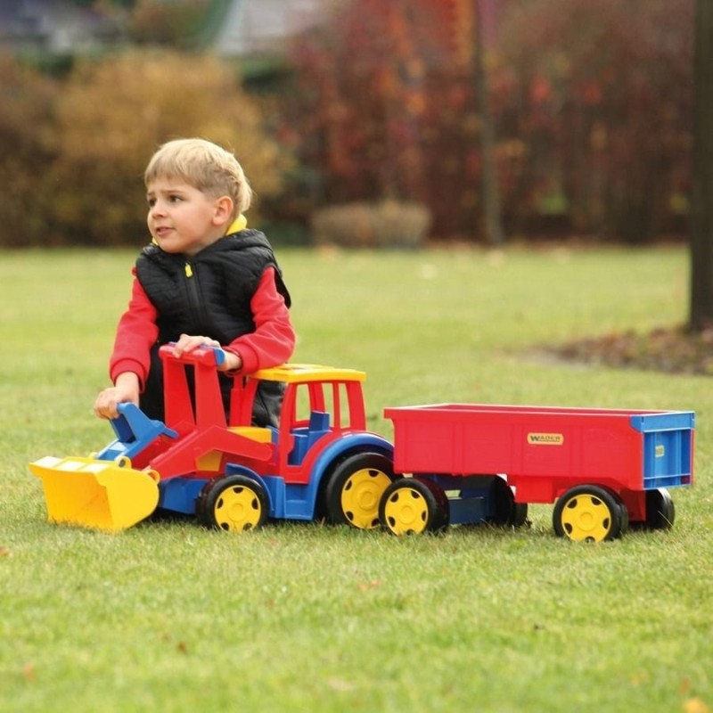 Трактор массивной конструкции, оснащенный подвижным ковшом, выполняет функции как погрузчика, так и бульдозера, что значительно увеличивает возможности игры. Прицеп с открывающейся задней дверью позволяет свободно загружать и перевозить различные предметы - от блоков до песка. Транспортные средства предназначены для поддержки двигательного развития, творчества и воображения детей.