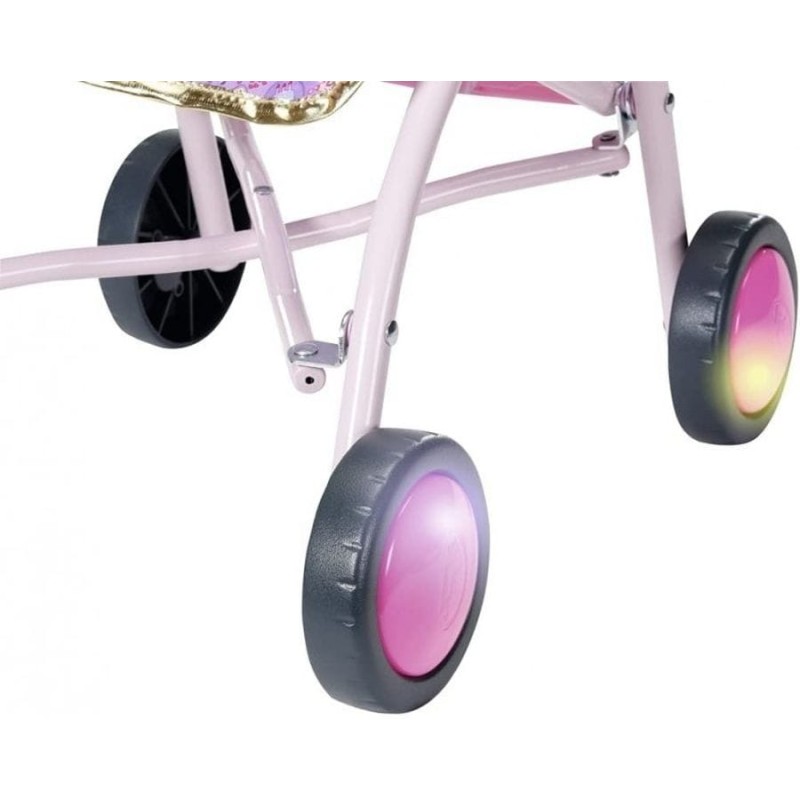 Когда тележка находится в движении, внешняя часть колес переливается яркими огнями. И когда Baby Born тянется к ручкам вверх, пытаясь схватить какую-то звездочку, ремни надежно удерживают ее в коляске. Для более длительных поездок Baby Born и ее братьев и сестер, чтобы исследовать Млечный Путь, коляска поставляется с бутылкой и ручкой. Когда вы вернетесь из экспедиции, его можно сложить и спрятать, он займет очень мало места.