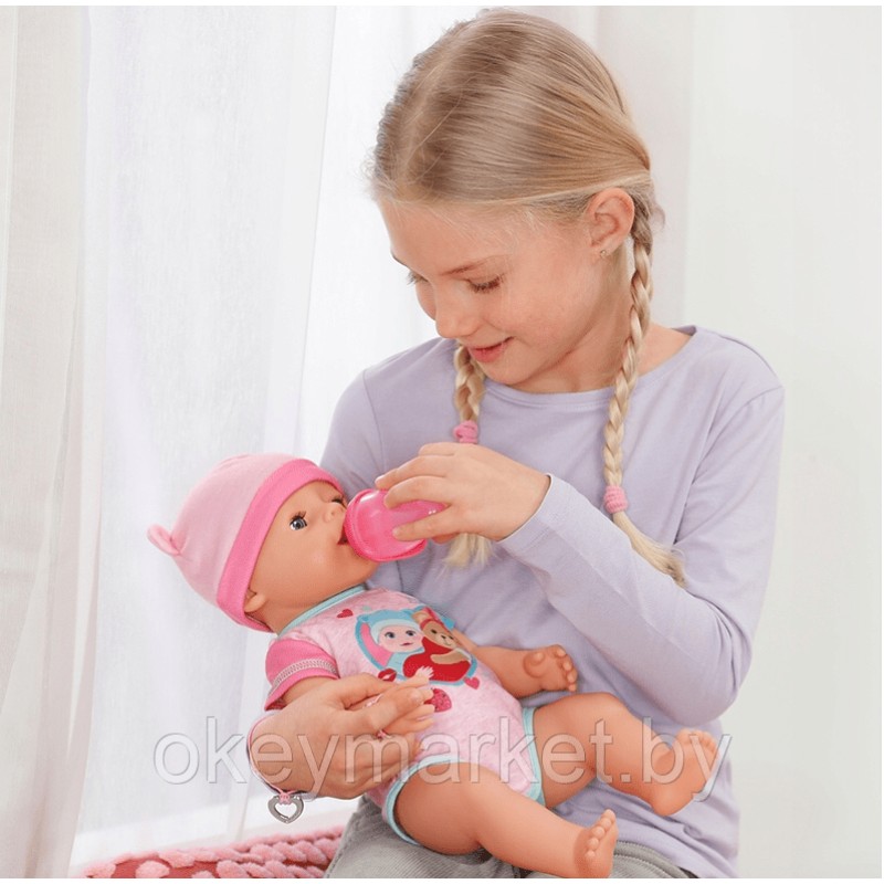 Эмма одета в розовое боди и шапочку. Она поставляется с десятью аксессуарами, включая собственную бутылочку для кормления. Наполните бутылку водой, а затем наблюдайте, как ваш малыш пьет. Хорошая девочка! Как настоящий ребенок, Эмма может намочить подгузник после кормления. Поменяй его поскорее, чтобы малышка не расстроилась. Или научите ее пользоваться горшком!