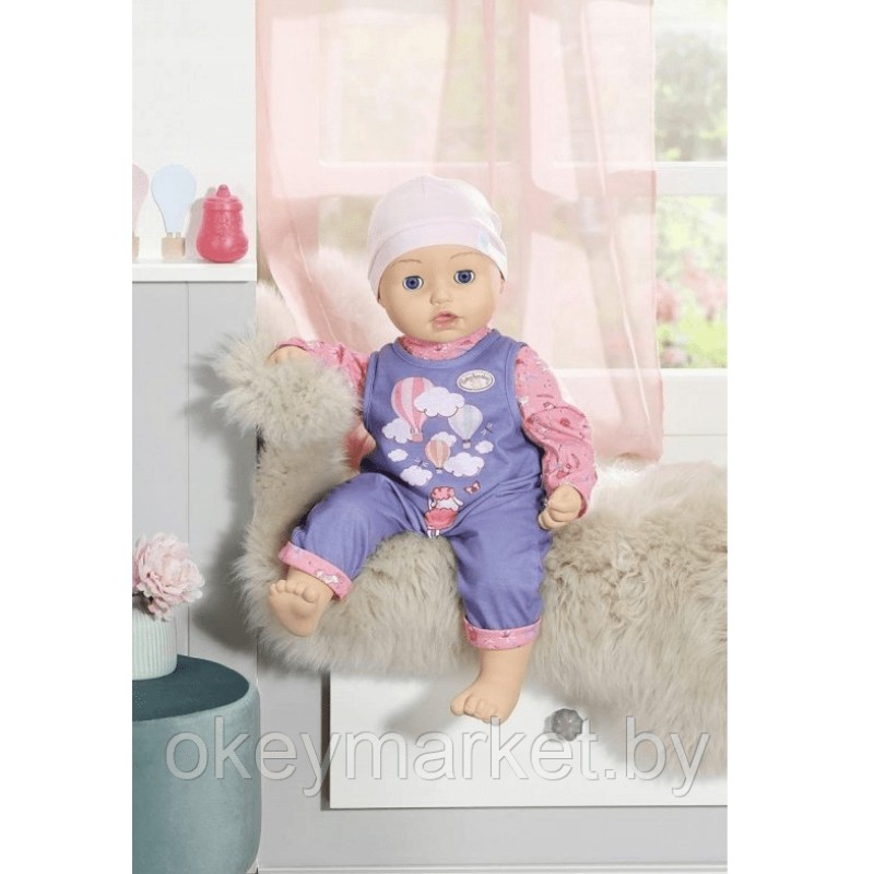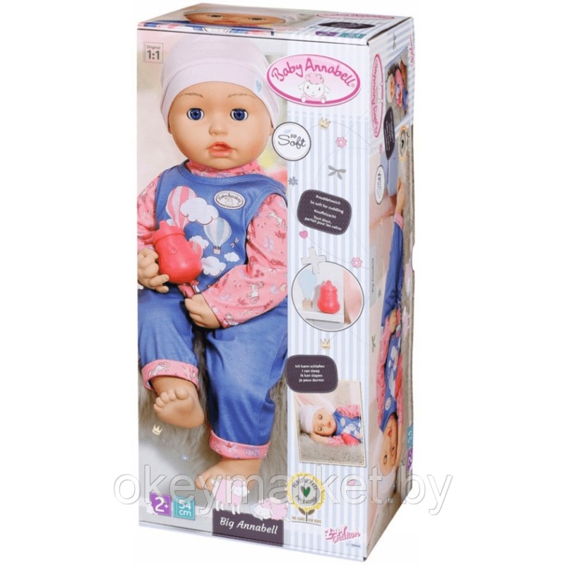Милая куколка отлично подходит для игры в роли маленького родителя. Вы можете кормить Аннабель из бутылочки, и когда вы уложите спать она закроет глаза! Малыш одет в милый комбинезон и шапочку , которые вы можете снять в любое время. На куклу тоже подойдет настоящая детская одежда!